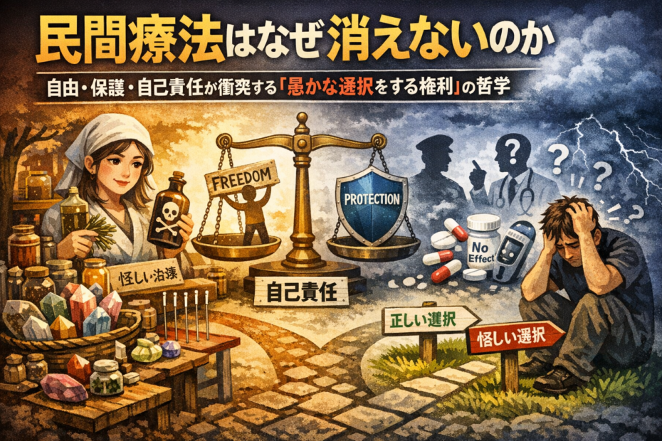 どうも、太陽です。 民間療法をめぐる議論は、しばしば「効くか、効かないか」という単純な話… 続きを読む »民間療法はなぜ消えないのか――自由・保護・自己責任が衝突する「愚かな選択をする権利」の哲学