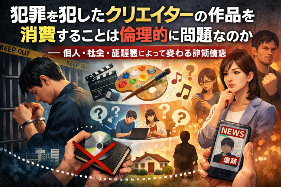 どうも、太陽です。 犯罪を犯したクリエイターの作品を消費することは倫理的に問題があるのか。 … 続きを読む »犯罪を犯したクリエイターの作品を消費することは倫理的に問題なのか――個人・社会・距離感によって変わる評価構造