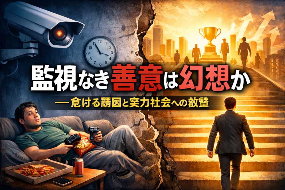 どうも、太陽です。 スーパーのレジで見た、ほんの小さな光景から考えたことがある。 人は監視さ… 続きを読む »監視なき善意は幻想か──怠ける誘因と実力社会への欲望