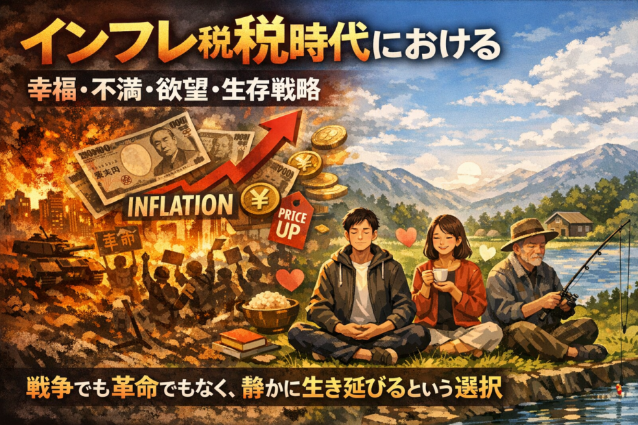 どうも、太陽です。 Gravityの議論ルームで「皆を幸せにする方法は何か」というテーマが出… 続きを読む »インフレ税時代における幸福・不満・欲望・生存戦略――戦争でも革命でもなく、静かに生き延びるという選択