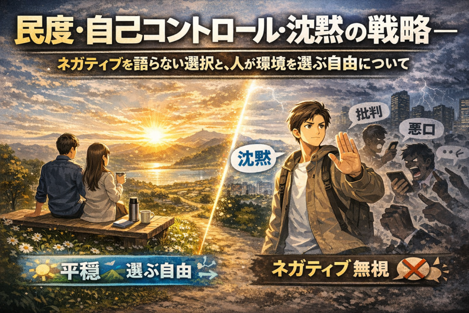 どうも、太陽です。 私は、できる限りネガティブなことを、心の中でも思わないようにし、さらに口… 続きを読む »民度・自己コントロール・沈黙の戦略──ネガティブを語らない選択と、人が環境を選ぶ自由について