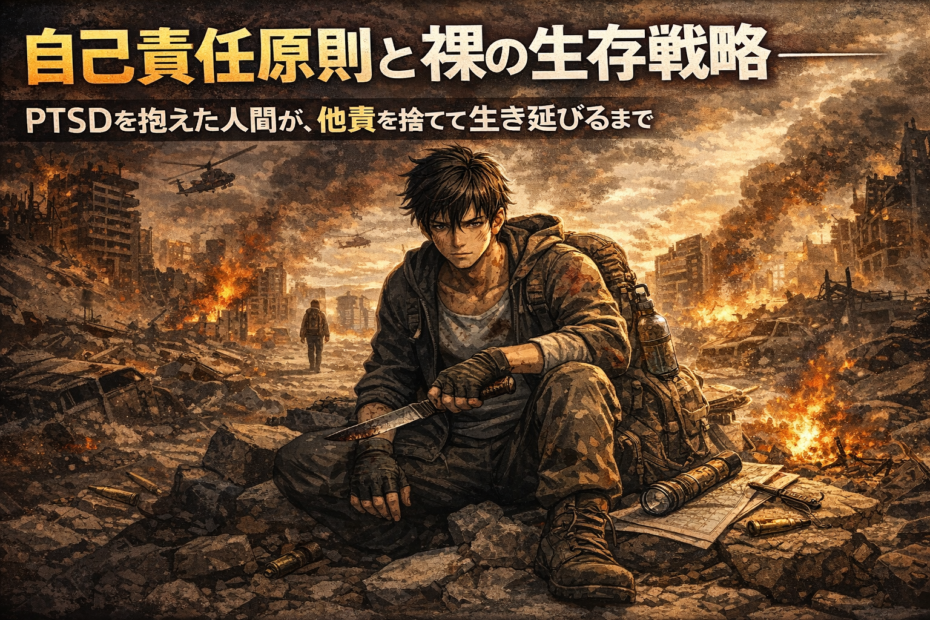 どうも、太陽です。 もし「人生を確実に、そして劇的に変えた概念は何か」と問われたなら、迷いな… 続きを読む »自己責任原則と裸の生存戦略──PTSDを抱えた人間が、他責を捨てて生き延びるまで